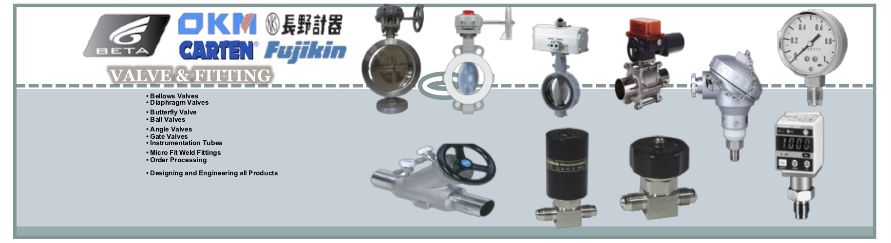 高純不銹鋼EP、BA/MP、AP等級(jí)管子/管道/管件;高純不銹鋼隔膜閥、波紋管閥、蝶閥、球閥、針閥、調(diào)壓閥等等;超純VCR、焊接、卡套接頭;以及設(shè)備應(yīng)用材料:壓力傳感器、壓力表、鋼瓶電子稱、火焰探測(cè)器、氣體探測(cè)器、鋼瓶緊急切斷裝置、加熱毯、加熱線、PTFE保溫纏繞帶;化學(xué)品供應(yīng)系統(tǒng)中的PFA閥門以及括口和焊接接頭,不銹鋼內(nèi)襯PFA/PTFE管道、閥門、接頭等配件。